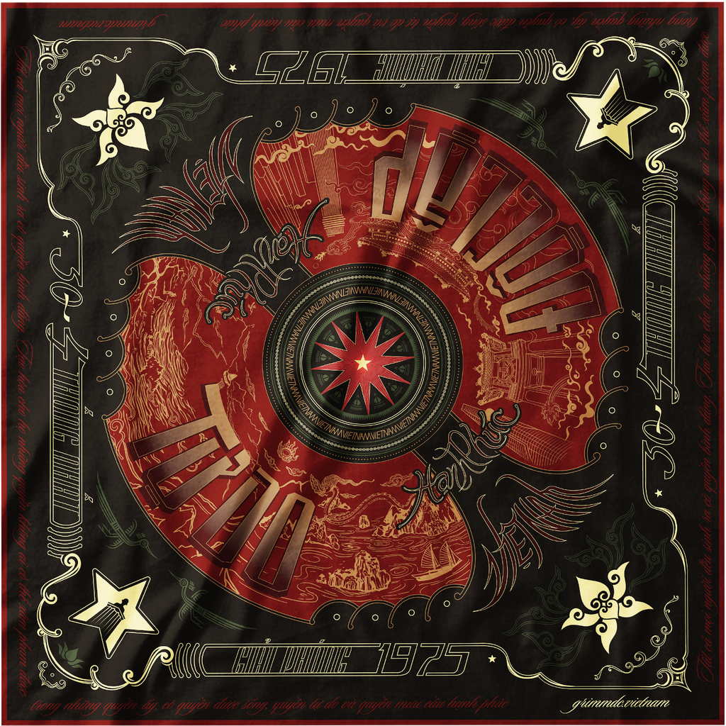 + Dòng chữ đỏ bao trọn khăn: "Tất cả mọi người đều sinh ra có quyền bình đẳng. Tạo hóa cho họ những quyền không ai có thể xâm phạm được; trong những quyền ấy, có quyền được sống, quyền tự do và quyền mưu cầu hạnh phúc."